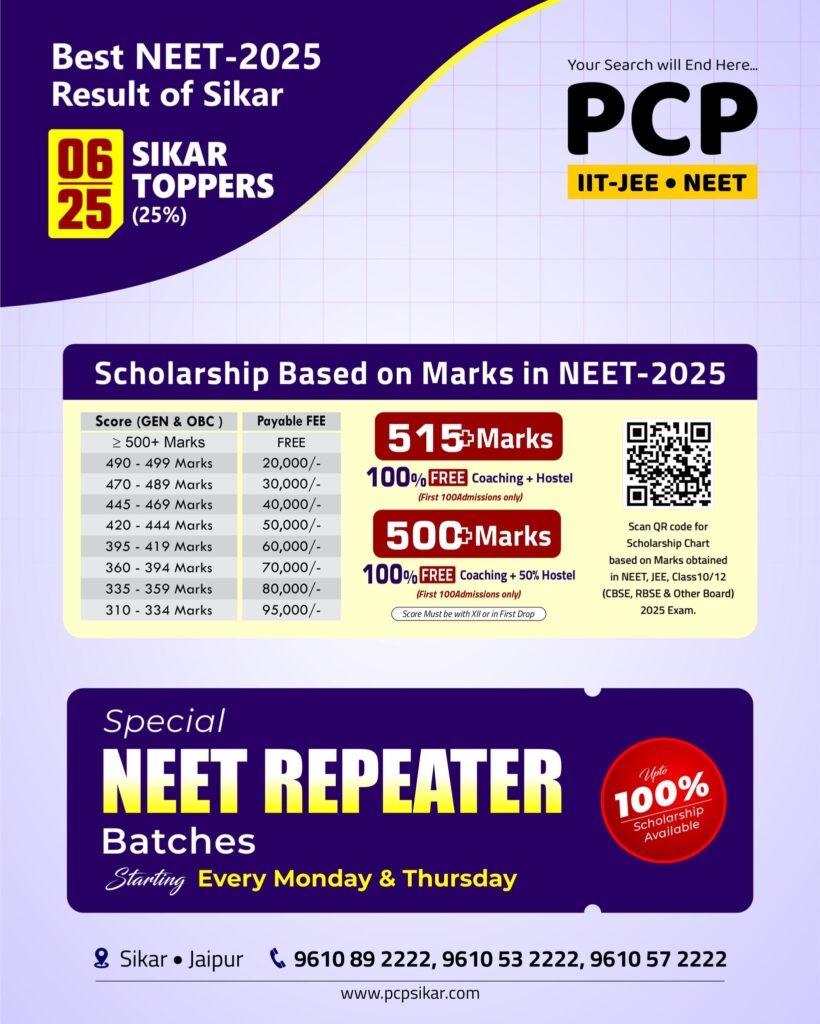 क्लास 12th के साथ और एक एक साल के ड्रॉप ईयर स्टूडेंट्स के लिए PCP ने बेहतरीन स्कॉलरशिप स्किम लॉन्च की है। जिसमें NEET एस्पिरेन्ट्स के पास PCP कैंपस में कोचिंग के साथ साथ होस्टल भी फ्री में प्राप्त कर सकते हैं। पहले 100 एस्पिरेन्ट्स जिनके NEET 2025 में 515 से अधिक स्कोर है उनके लिए कोचिंग, रहना व खाना फ्री होगा।पहले 100 ऐसे एस्पिरेन्ट्स जिनका स्कोर 500 से अधिक है उनके लिए कोचिंग की कोई भी फीस नहीं होगी व होस्टल फीस में 50 फीसदी डिस्काउंट मिलेगा।