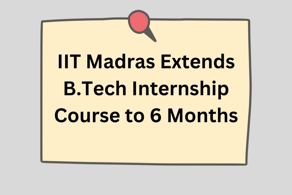 इंडियन इंस्टीट्यूट ऑफ टेक्नोलॉजी(IIT) मद्रास ने बीटेक सिलेबस में बड़ा बदलाव किया है, जिसके बाद IIT मद्रास में बीटेक स्टूडेंट्स को तीन महीने की जगह 6 महीने की इंटर्नशिप करने का मौका मिलेगा। यह बदलाव 2024-25 के बैच से लागू होगा। मीडिया रिपोर्ट्स के मुताबिक IIT मद्रास ने प्लेसमेंट को बढ़ाने व स्टूडेंट्स को प्रैक्टिकल एक्सपोज़र बढ़ाने के लिए ऐसा किया है। नए सिलेबस के अनुसार स्टूडेंट्स को 6th सेमस्टर में कोर पढ़ाई नहीं करनी होगी और वे अपने वैकल्पिक कोर्स को छठे सेमेस्टर से पहले या आगे पूरा कर सकते हैं।