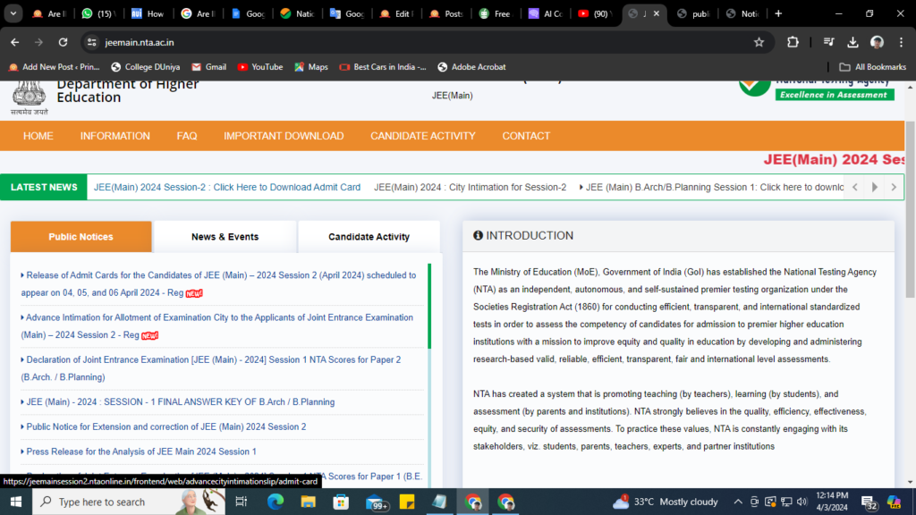 Step 2nd: On the website’s home page, you will see a news article about the JEE Mains 2024 Session-2 Admit Card in the header. Click on that news.