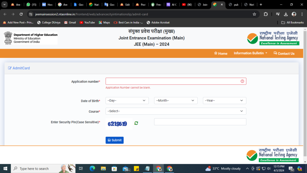 Step 3rd: You will be asked to enter your Application Number, D.O.B., and Security Pin here. Enter the credentials and tap on the Submit button.