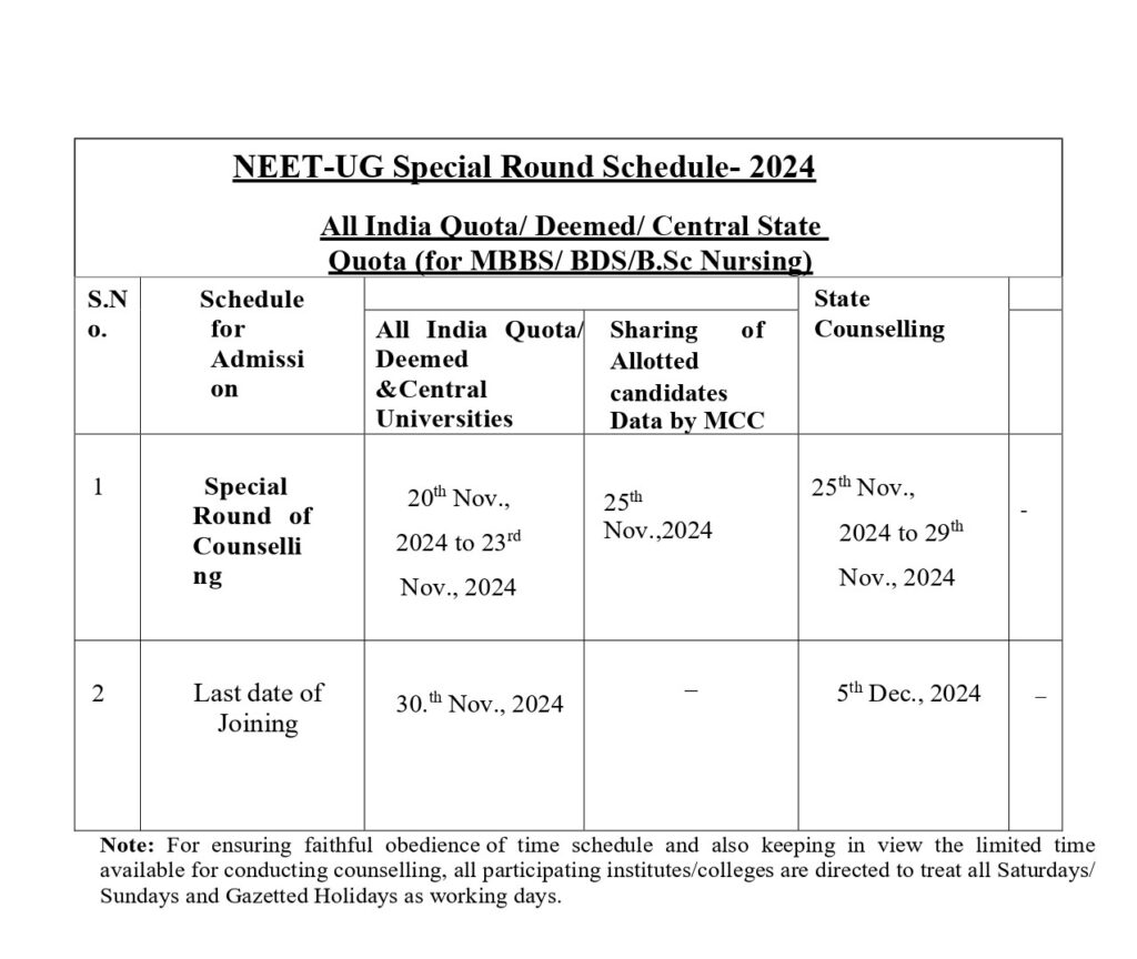 MCC ने AIQ और State दोनों की स्ट्रे वैकेंसी शेड्यूल के लिए भी एक आधिकारिक नोटिस जारी किया है। जिसमें ऑल इंडिया कोटा, डीम्ड यूनिवर्सिटी, सेंट्रल व स्टेट यूनिवर्सिटी में सभी MBBS, BDS व बीएससी नर्सिंग की सभी सीटों के स्पेशल राउंड का शेड्यूल बताया गया है। जिसके अनुसार AIQ/Deemed/Central यूनिवर्सिटी में स्पेशल राउंड की काउंसलिंग 20 नवंबर से लेकर 23 नवंबर 2024 तक चलेगी जबकि इसमें कैंडिडेट्स के लिए जॉइन करने के लिए लास्ट डेट 30 नवंबर निर्धारित की गई है। वहीं बात करें स्टेट काउंसलिंग की तो स्पेशल राउंड की काउंसलिंग 25 नवंबर से लेकर 29 नवंबर 2024 तक चलेगी व कैंडिडेट्स को 5 दिसंबर 2024 से पहले अलॉट किया गया कॉलेज जॉइन करना अनिवार्य है।