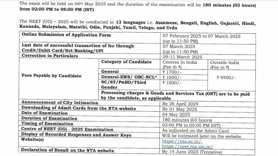 NEET UG 2025 का एग्जाम 4 मई को आयोजित होगा और रिजल्ट की घोषणा 14 जून को होगी। लेकिन NTA ने इस बार एग्जाम फॉर्मेट, सेक्शन B से लेकर फ़ोटो अपलोड जैसे काफी बदलाव किए हैं जिनको लेकर हम आगे बात करेंगे।