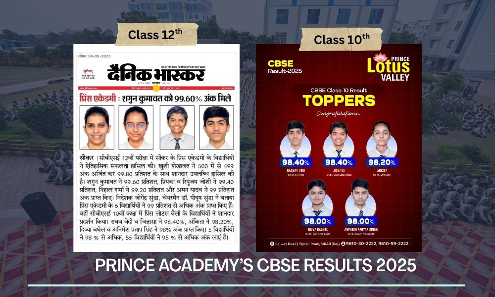 इतना ही नहीं CBSE 2025 के रिजल्ट्स में Prince Acadeny के क्लास 12th के 6 के अधिक स्टूडेंट्स ने 99 फीसदी से ज्यादा मार्क्स प्राप्त किए हैं। खुशी के अलावा Prince Academy की ही छात्रा शगुन कुमावत ने 500 में से 498 के स्कोर के साथ 99.60 फीसदी, प्रियंका ने 497 के स्कोर के साथ 99.40, छात्र रिपुंजय जोशी ने 497 के स्कोर के साथ 99.40, निहाल शर्मा ने 496 के स्कोर के साथ 99.20 व अमन यादव ने 500 में से 495 के स्कोर के साथ 99.00 फीसदी मार्क्स प्राप्त कर सीकर जिले का नाम रोशन किया है।