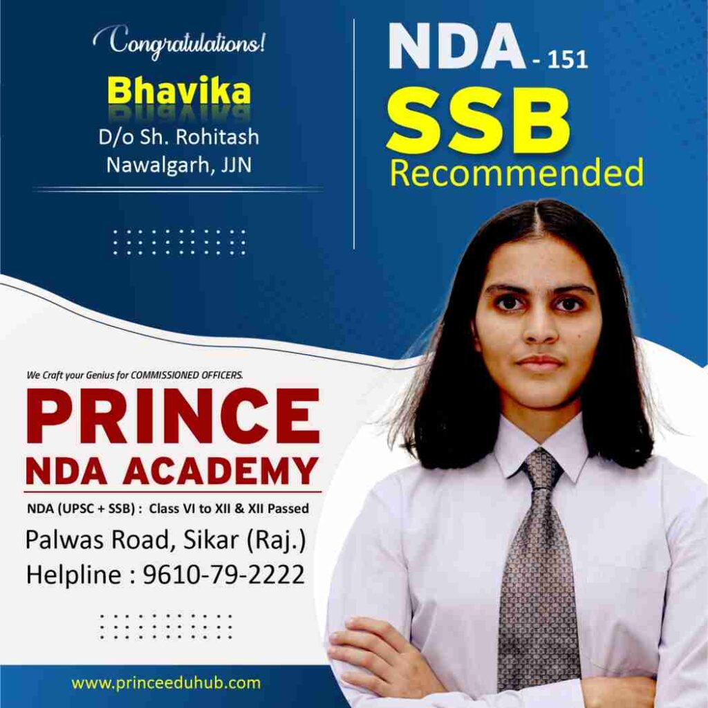 Prince NDA Academy की स्टूडेंट भाविका पुत्री रोहताश डुमरा ने UPSC NDA व SSB क्लियर कर फीमेल कैटेगरी में AIR-1 हासिल किया है। भाविका के पिता आर्मी एविएशन में कर्नल हैं, लेकिन एयर फोर्स में लड़ाकू विमान उड़ाने का उनका सपना अब भाविका पूरा करने जा रही है। आइये जानते हैं क्यों भाविका ने डॉक्टर या इंजीनियरिंग बनने की बजाय एयर फोर्स में फ़्लाइंग ऑफिसर बनने का विकल्प चुना? और UPSC NDA जैसी मुश्किल परीक्षा के बाद 5 दिन लंबे SSB इंटरव्यू को पास कर महिला कैटेगरी में AIR-1 व ऑल इंडिया कैटेगरी में 10वां रैंक हासिल कर Prince NDA Academy के साथ साथ सीकर जिले का नाम भी रोशन किया।